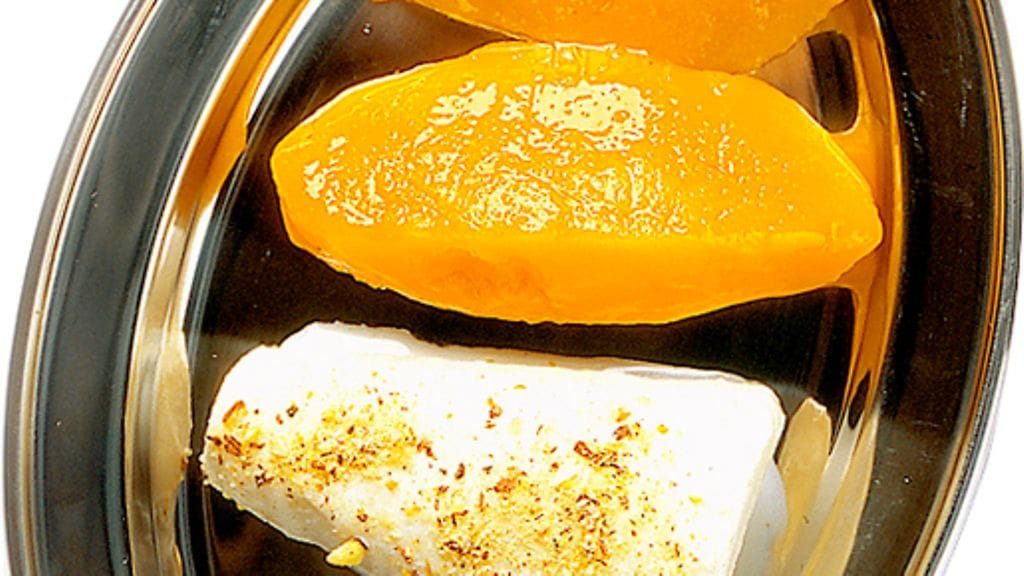 2. Sekoita joukkoon mantelit ja pistaasipähkinät ja kaada seos vuokaan tai neljään annosvuokaan ja anna jäähtyä. Pane pakastimeen ja anna jäätelön jäätyä vähintään vuorokauden ennen tarjoilua.