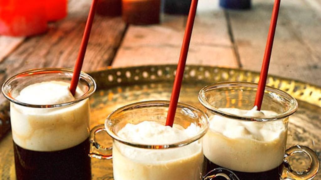 2. Täytä kuumalla, vahvalla kahvilla, mutta älä aivan reunaan asti. Lisää lusikallinen kermaa ja tarjoile.