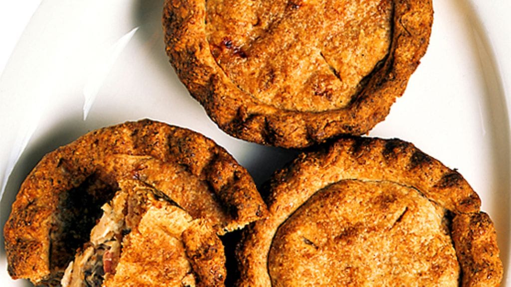 2. Kuumenna uuni 225 asteeseen. Pese sitruuna hyvin ja raasta kuori. Silppua persilja. Sulata voi miedolla lämmöllä kattilassa. Sekoita joukkoon vehnäjauho ja lisää maito vähitellen vatkaten, kunnes seos paksuuntuu. Hauduta vielä 3-5 minuuttia sekoitellen. Leikkaa liha sentin kuutioiksi ja kuutioi myös kinkku. Sekoita kastikkeeseen, liha, kinkku, leivänmurut, sitruunankuori, persilja, suola ja pippuri. Ota kattila liedeltä.