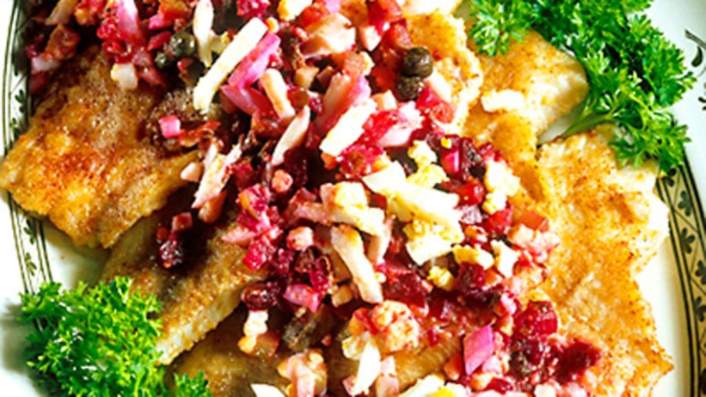 2. Silppua munat, maustekurkku ja punajuuri, sekoita ne sekä kaprikset keskenään ja sirottele fileiden päälle. Kaada kuuma voisula päälle.
