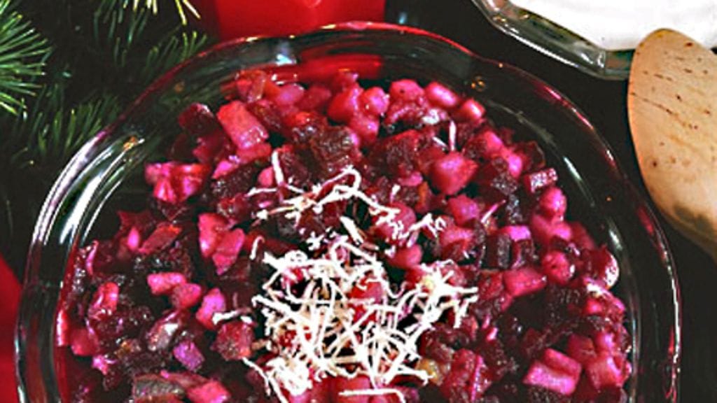 Raastettu piparjuuri ja anjovisfileet antavat potkua tälle rosollivariantille.