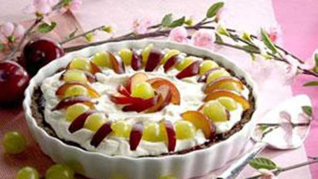 Valmista täyte. Vatkaa kerma vaahdoksi, mausta sokerilla ja lisää rahka. Kostuta torttupohja hyvin. Levitä päälle hillo tai sose ja sen päälle kermarahka. Koristele kauniisti hedelmillä ja tuoreilla yrteillä.
