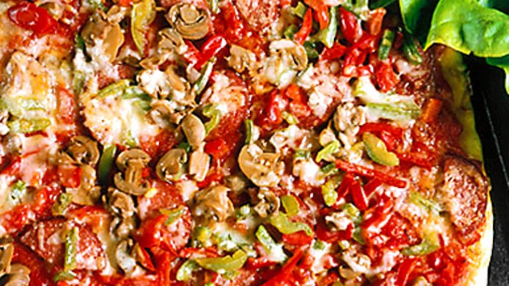 4. Levitä taikinalle tomaattikastike, ripottele päälle kaikki täytteet, viimeiseksi juusto.