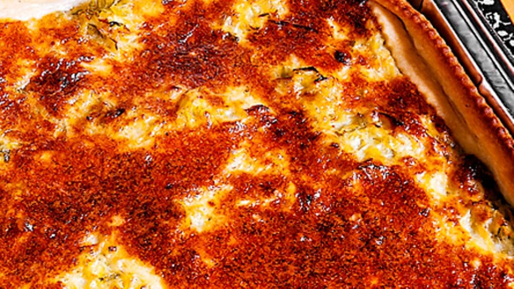 3. Alenna lämpö 225 asteeseen. Suikaloi purjo. Sulata voi kasarissa, lisää purjosuikaleet ja keitä pehmeäksi. Vatkaa yhteen muna, kerma, juusto ja mausteet. Levitä purjo piiraspohjalle ja kaada munaseos päälle. Paista kypsäksi noin 20 minuuttia.