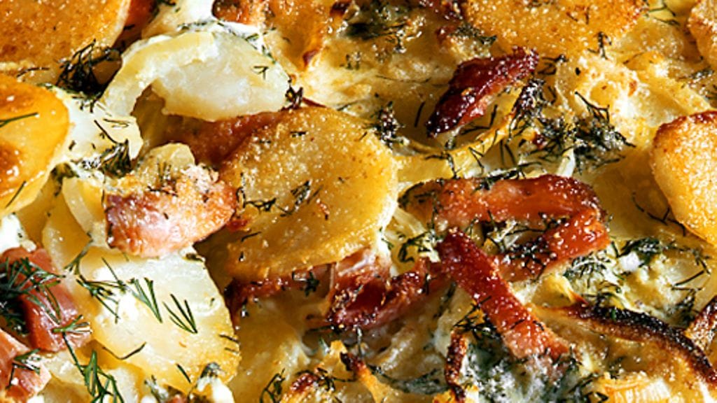 2. Lado vuorotellen perunaa, sipulia ja lohta kevyesti voideltuun uunivuokaan. Vatkaa munat ja maito, lisää tilli ja mausta kevyesti valkopippurilla. Kaada munamaito päälle, sihtaa viimeiseksi vuokaan hieman korppujauhoja.