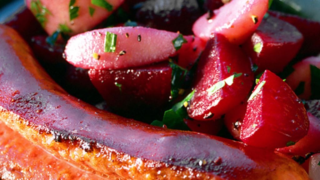 3 Jaa makkarat ja punajuuri-omenaseos lämpimille lautasille, koristele basilikalla.