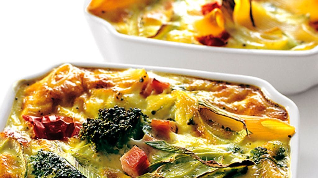 2. Huuhtele, puhdista ja suikaloi purjo. Irrota parsakaalin nuput ja suikaloi paprika. Kuullota kasvikset, pasta ja kasslersuikaleet voissa paistinpannulla. Pane ainekset voideltuun, uuninkestävään vuokaan.