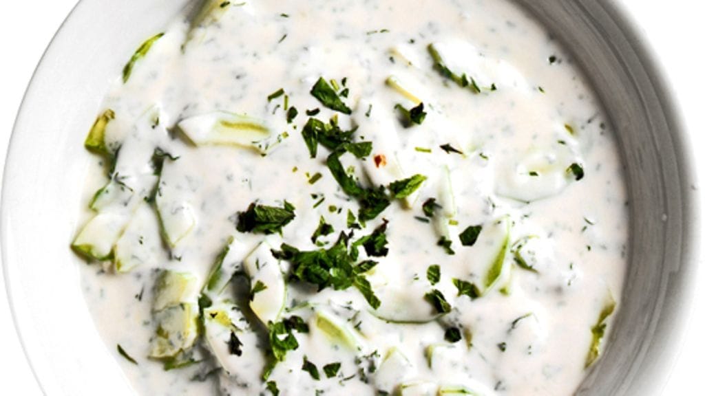 2. Hiero toisen kulhon sisäpuoli valkosipulinkynnellä. Mittaa kulhoon viinietikka, tilli ja jogurtti. Sekoita hyvin ja kaada kurkkujen päälle.