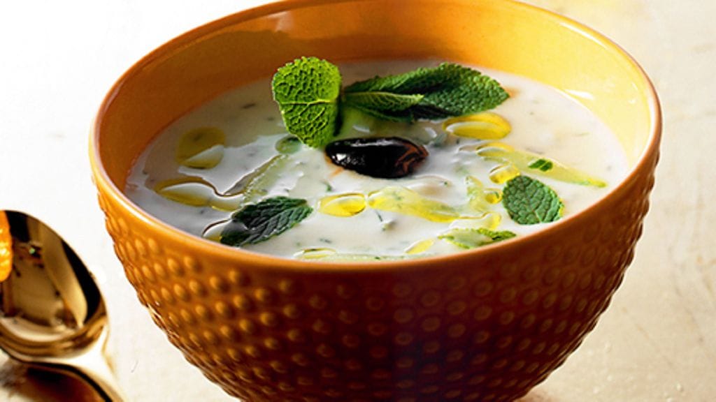 3. Irrota mintunlehdet oksista. Valuta öljy kurkkujogurttiseoksen päälle, koristele oliiveilla ja sirottele mintunlehdet pinnalle juuri ennen tarjoilua.
