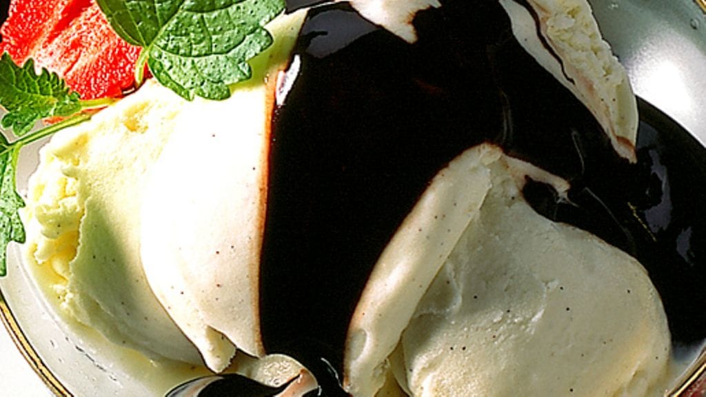 2. Annostele vaniljajäätelö jälkiruokakulhoihin ja kaada päälle lämmintä kastiketta. Koristele tuoreilla marjoilla ja vohvelikekseillä.