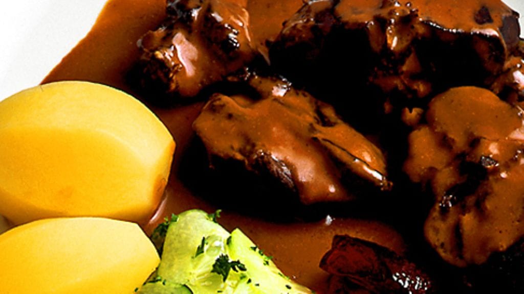 3. Nosta lihat, porkkana- ja selleripalat kannelliseen tarjoiluastiaan. Poista ne osat, joita ei tarjoilla. Siivilöi kastike, kiehauta vielä ja kaada lihan ja vihannesten päälle. Tarjoile keitettyjen perunoiden, pihlajanmarjahyytelön sekä etikassa ja tillisilpussa hölskytettyjen kurkkujen kanssa.