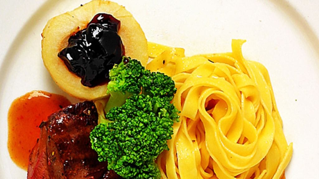 3. Kuori ja puolita ja poista siemenkodat. Kiehauta omenanpuolikkaat. Täytä jäähtyneet puolikkaat mustaherukkahyytelöllä. Keitä parsakaalinnuput pehmeiksi kevyesti suolatussa vedessä. Keitä pasta pakkauksen ohjeen mukaan. Irrota selkäpaloista lihat. Kaada folioon kertynyt lihaneste kastikkeen joukkoon. Asettele omenat, parsakaali ja liha tarjoiluvadille. Tarjoile kastike ja pasta erikseen.