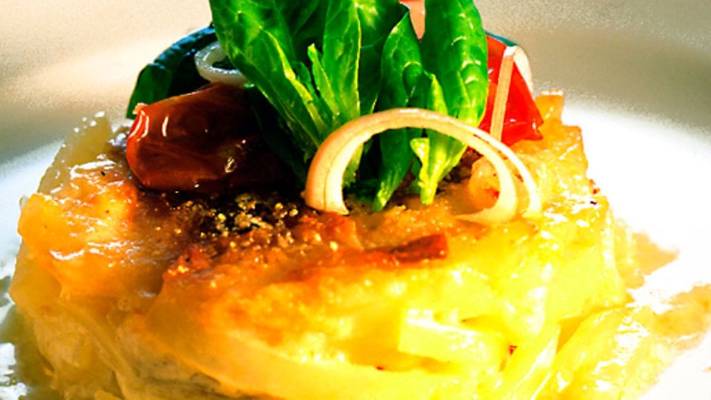 1. Kuumenna uuni 225 asteeseen. Kuori ja viipaloi sipuli, kuori ja suikaloi perunat tulitikunkokoisiksi. Voitele uuninkestävä vuoka ja laita sen pohjalle puolet perunasuikaleista. Peitä anjovisfileillä, säästä liemi. Laita päälle sipuli ja loput perunatikuista.