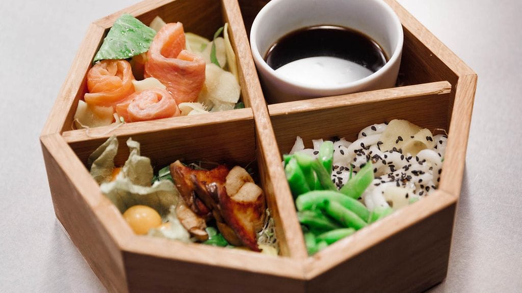 Kokoa boxin kahteen laatikkoon salaatti thaibasilikasta ja silmusalaatista. Laita kastikkeeksi keltajuurten lientä. Kiehauta teriyakikastiketta varten kattilassa soijaa 2dl  ja valkosipulia 1 kynsi paloiteltuna sekä ruokosokeria 3-4rkl ja viinietikkaa 1rkl ja 1 limen menu. Jäähdytä teriyakikastike.