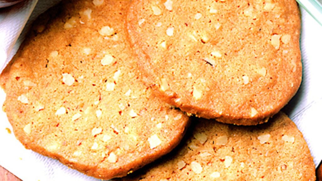 3. Kuumenna uuni 150 asteeseen ja vuoraa kaksi peltiä leivinpaperilla. Paloittele pötkö 3-4 mm paksuiksi viipaleiksi. Laita viipaleet pelleille, jätä väliin hieman tilaa koska ne laajenevat. Paista pikkuleipiä 15-20 minuuttia tai kunnes ne ovat kevyen kullanruskeita. Anna jäähtyä pellillä muutama minuutti ennen kuin siirrät ne ritilälle, jossa ne saavat jäähtyä täysin.