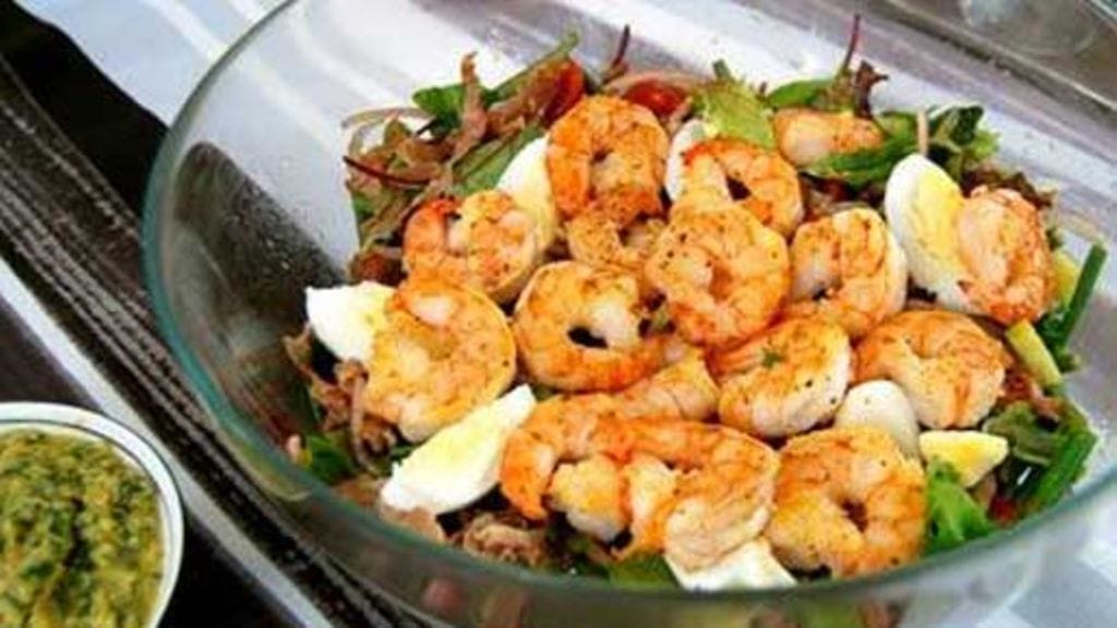 Leikkaa parmankinkku suikaleiksi ja paista se pannulla rapeaksi. Mausta vihannekset etikalla, oliiviöljyllä, suolalla ja pippurilla. Sekoita hyvin ja kaada tarjoiluastian pohjalle. Pyöräytä salaatit saman kulhon kautta ja aseta vihannesten päälle. Ripottele päälle parmankinkku ja kananmunalohkot. Lopuksi paista ravut nopeasti pannulla ja mausta ne suolalla ja pippurilla. Asettele salaatin päälle ja tarjoile heti, hyvä leivän kera.
