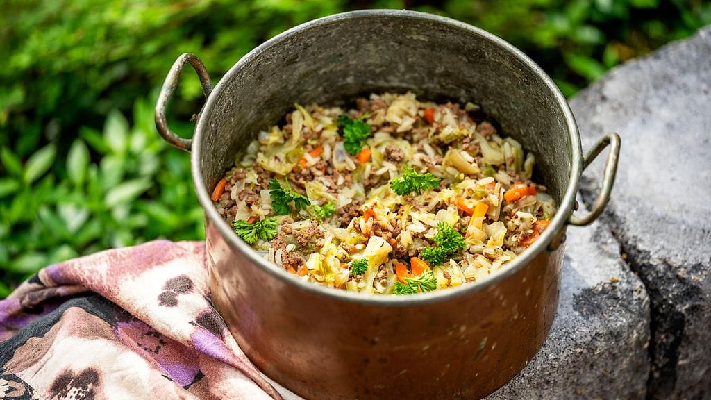 - Kuumenna öljy kattilassa ja lisää kaali, sipuli ja porkkanat. Kääntele kunnes ainekset pehmenevät.