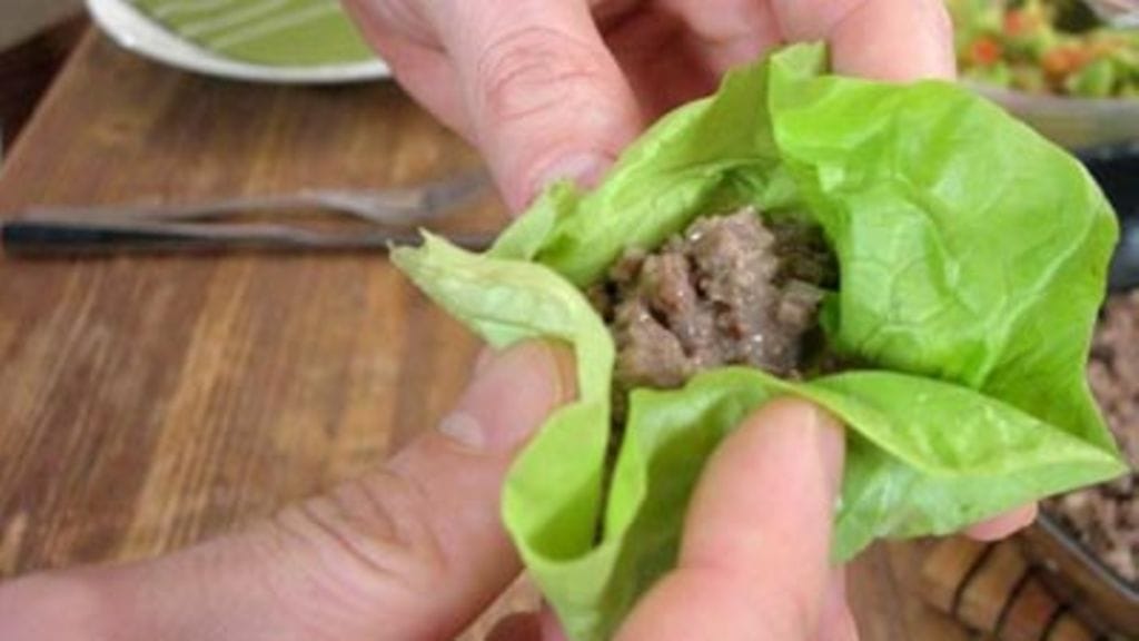 Silppua sipulit ja valkosipulikynnet. Paista ne jauhelihan kanssa pannulla. Kun liha on ruskistunut, lisää joukkoon oman maun mukaan inkivääriä, soijaa, chiliä ja lopuksi kookosmaitoa. Hauduta miedolla lämmöllä kymmenisen minuuttia. Mausta sitruunan mehulla ja suolalla. Täytä keräsalaatin lehtiä maustetulla jauhelihalla ja syö käsin.