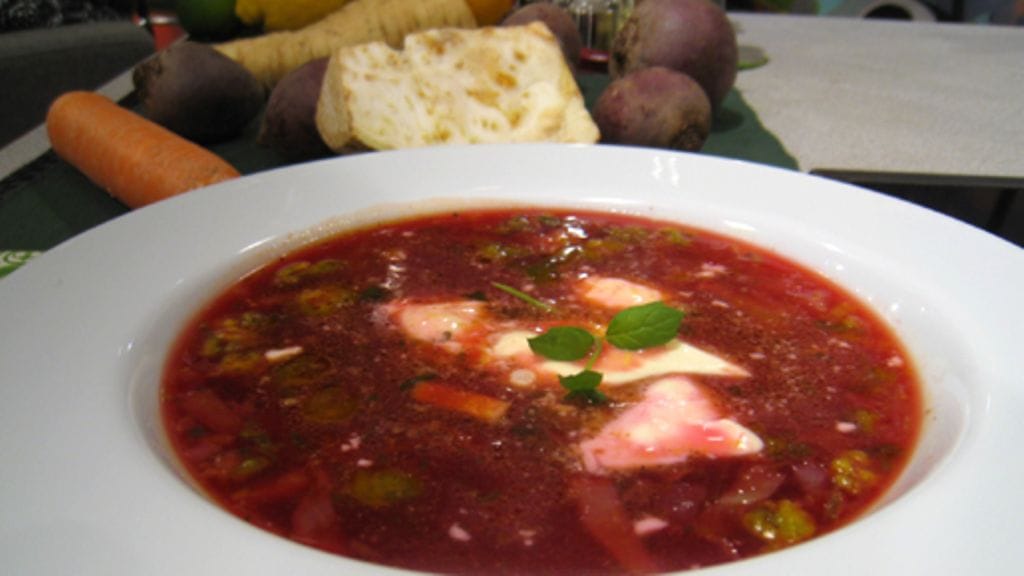 Kuumenna öljy kattilassa ja ruskista jauheliha. Lisää raastetut kasvikset ja jatka paistamista 5 minuuttia. Lisää loput ainekset kattilaan ja anna keiton kiehua noin 20 minuuttia. (Tarjoa smetanan kanssa.)