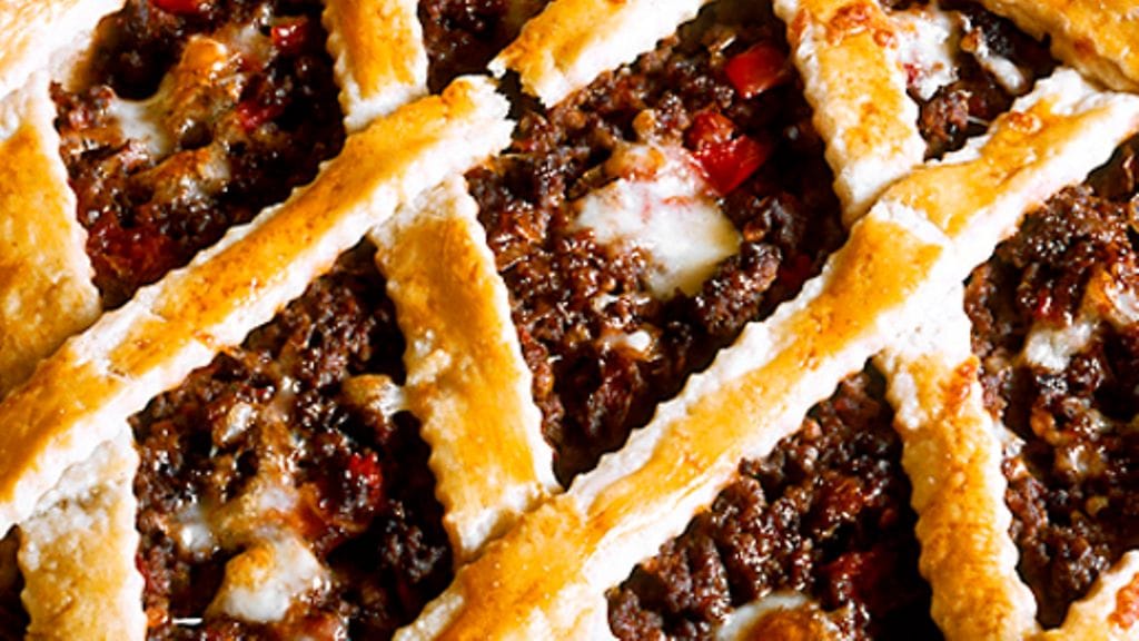 1. Kuumenna uuni 225 asteeseen. Sekoita murutaikina voista ja jauhoista, lisää vesi työstä taikinaksi ja laita kylmään 1 tunniksi. Ruskista jauheliha hyvin ja murusta se.