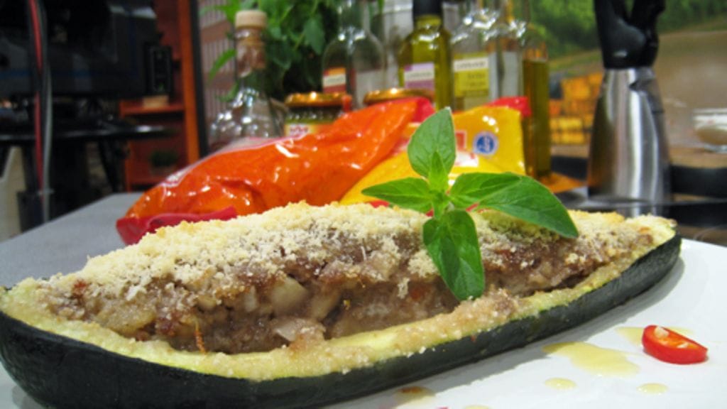 3. Sekoita kaikki lihatäytteeseen ja levitä puolikkaille. Lusikoi valutettu tomaattimurska mukaan vadille.