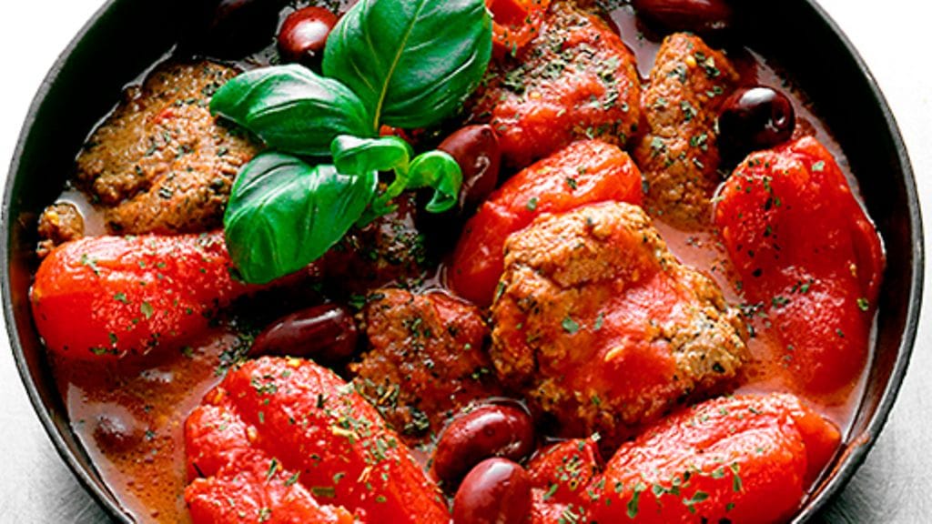 3. Kaada tomaattipurkkien sisältö paistinpannulle ja lisää joukkoon tomaattipyree, mausta suolalla ja pippurilla ja sekoita. Nosta pihvit kastikkeeseen ja anna porista kannen alla, kunnes pihvit ovat läpikypsiä. Sirottele päälle oliivit ja koristele basilikalla ennen tarjoilua.