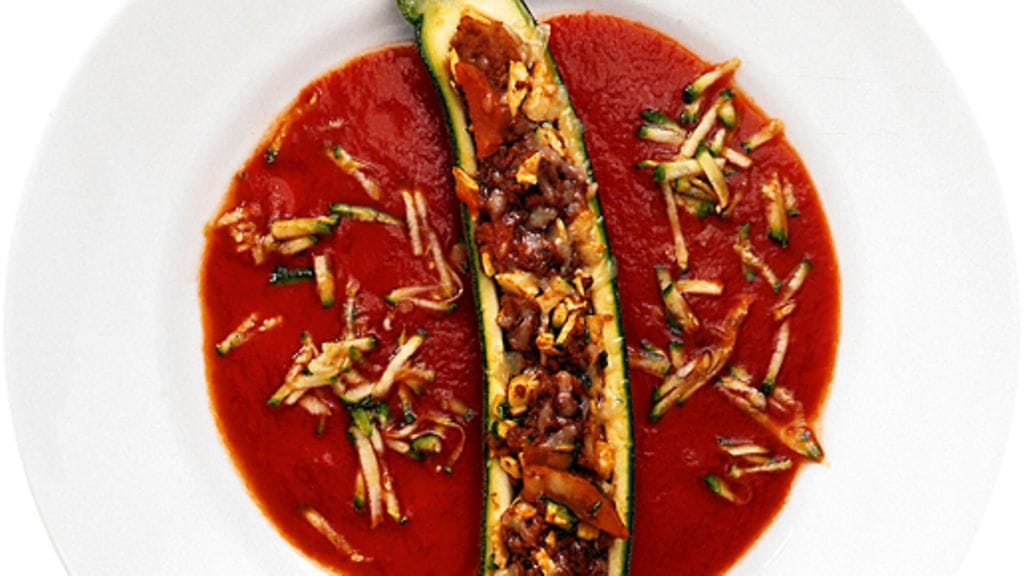 3. Jaa täyte kesäkurpitsanpuolikkaisiin ja ripottele päälle juustoraaste. Gratinoi 275-asteisessa uunissa kunnes juusto on sulanut ja pinta on kauniin värinen. Kuori ja hienonna sipuli tomaatticoncasséen. Sekoita tomaattimurska sauvasekoittimella sopivan karkeaksi kastikkeeksi, lisää sipuli. Mausta viinietikalla, suolalla ja pippurilla. Tarjoile täytettyjen kesäkurpitsojen kera.