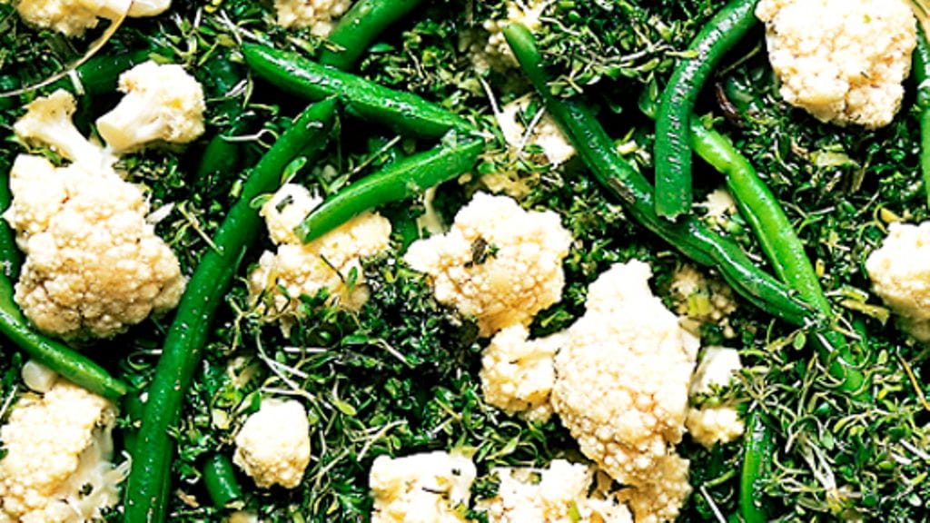 3. Sekoita kukkakaali ja vihreät pavut vihreiden yrttisilppujen kanssa kulhossa. Sekoita kastike ja kaada ainesten päälle.