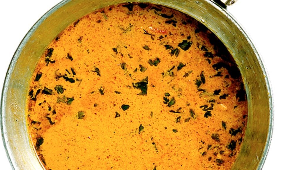 3. Sekoita juuri ennen tarjoilua keittoon jogurtti, kerma ja korianteri. Lämmitä varovasti - keitto ei saa kiehua, sillä silloin jogurtti juoksettuu. Lisää tarvittaessa suolaa.
