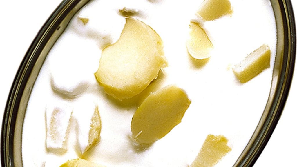 2. Viipaloi tai kuutioi perunat, kuori ja hienonna sipuli. Vatkaa jogurtti tasaiseksi. Sekoita jogurtti, perunat, sipuli ja juustokumina, mausta suolalla ja pippurilla. Anna seoksen seistä jääkaapissa, kunnes se on kylmää.