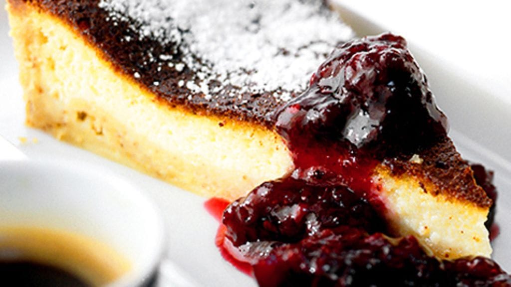 2. Kuumenna uuni 175 asteeseen. Vatkaa juusto pehmeäksi ja tasaiseksi jogurtin, hunajan ja karvasmanteliöljyn kanssa. Kaada täyte piirakkakuoreen ja paista uunissa 30 minuuttia. Anna jäähtyä ja laita jääkaappiin vähintään 4 tunniksi.