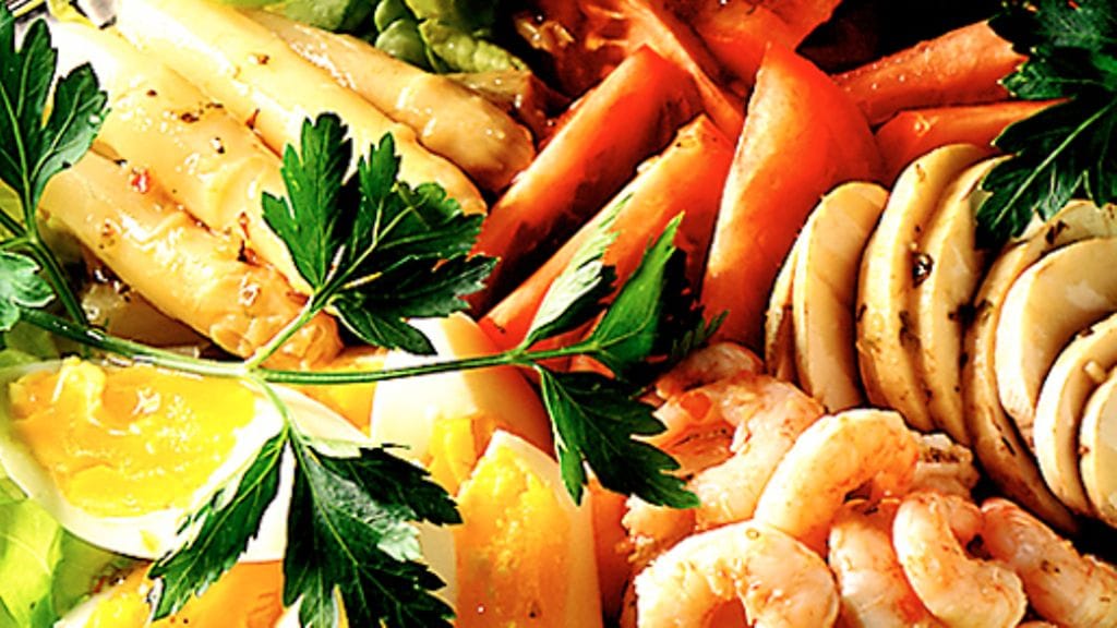 1. Kuori katkaravut, viipaloi herkkusienet, lohko tomaatit, kuori munat ja leikkaa nekin lohkoiksi. Valuta parsat.