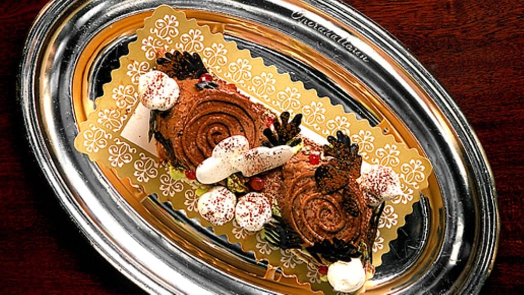 3. Levitä puolet voitäytteestä kakkupohjan päälle ja kääri samalla tavalla kuin kääretorttu. Leikkaa kummastakin päädystä viisto pala. Pursota jäljelle jäänyt voitäyte jouluhalon pinnalle pursottimella ja asettele haluamasi koristeet halon päälle. Koristele marengeilla.