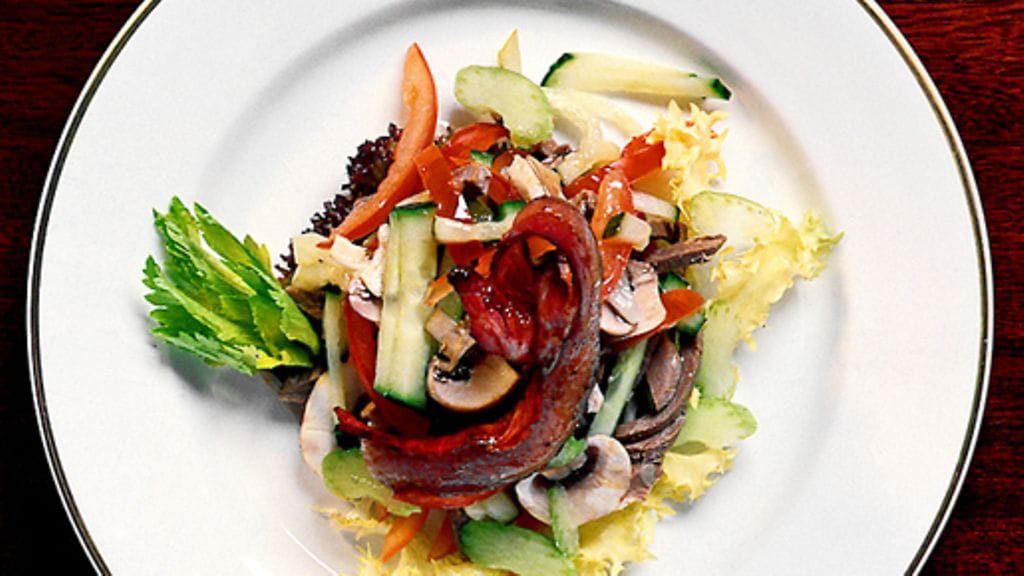 1. Puhdista ja viipaloi kurkku, paprika, selleri ja herkkusienet.