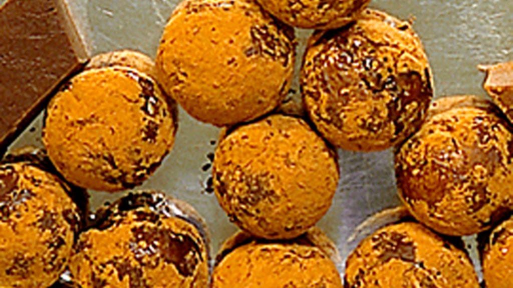 3. Kasta kuulat sulaan suklaaseen. Jäähdytä ja pyörittele kaakaojauheessa.