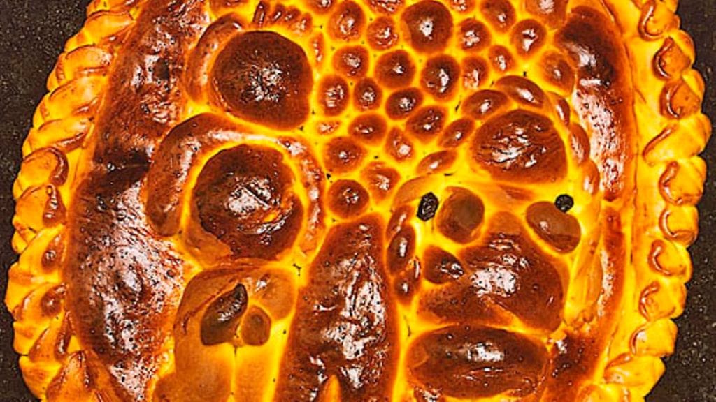 4. Muotoile lopusta taikinasta koristeita, asettele ne pullan päälle. Penslaa munalla ja paista uunissa n. 20 minuuttia.
