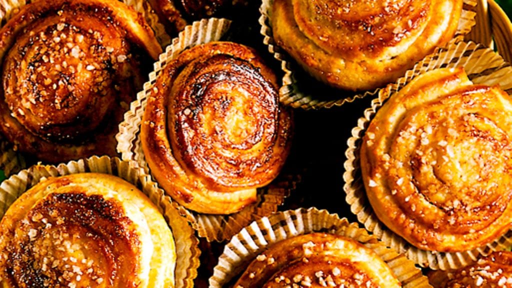 2. Levitä levyille voita, sihtaa päälle tomusokeria ja kardemummaa. Kääri kokoon, leikkaa paloiksi ja laita palat paperivuokiin. Anna kohota liinan alla n. 1 ½ tuntia.