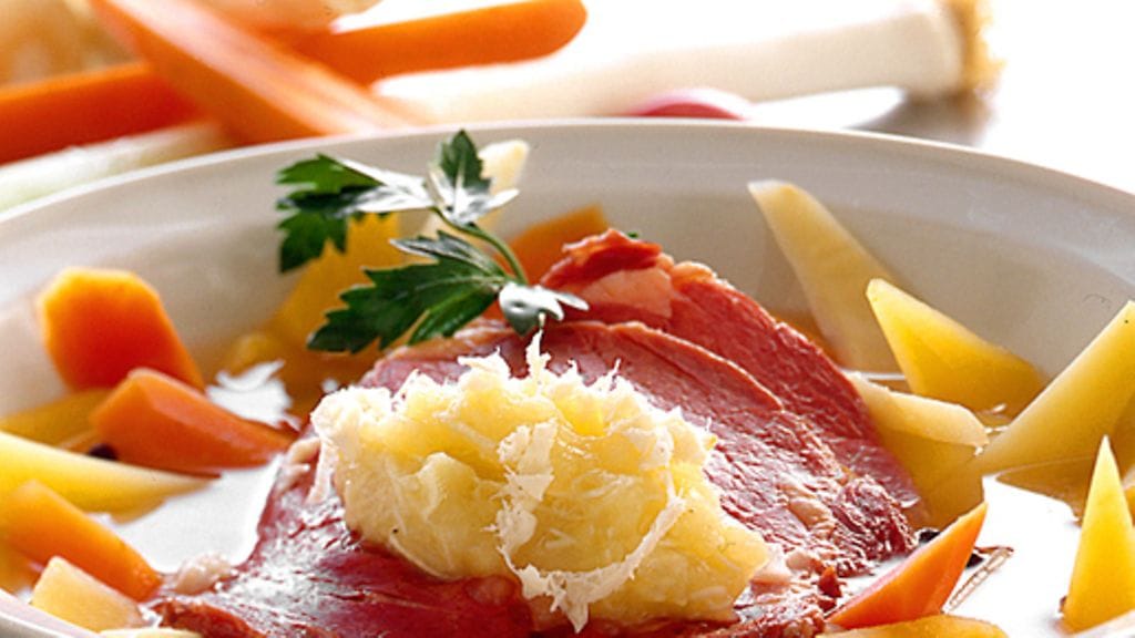 3. Raasta piparjuuri. Nosta juurekset liemestä reikäkauhalla ja pidä ne lämpiminä. Lämmitä lihaviipaleet liemessä. Nosta juurekset lämmitetyille keittolautasille, kaada lientä päälle ja lisää lihaviipaleet. Ripota lopuksi annoksille piparjuuriraaastetta ja lehtipersiljaa.