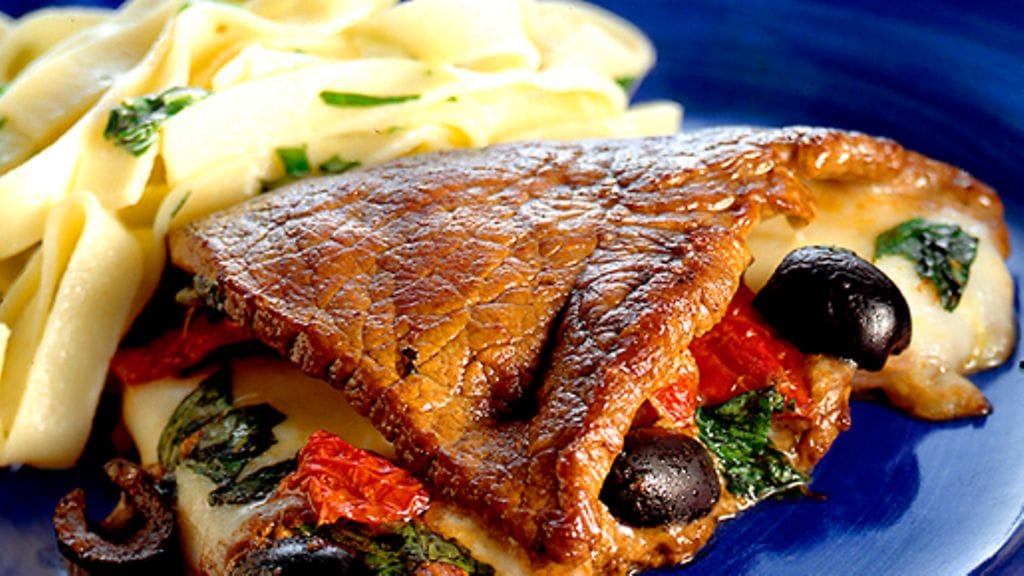 3. Aseta cheddarviipale jokaiselle pihvinpuolikkaalle, Jaa pinaatti, tomaatit ja oliivit päälle. Käännä pihvin täyttämätön puoli täytteen päälle ja kiinnitä cocktailtikuilla. Kuumenna pihvejä uunissa 10 minuuttia. Tarjoa juuri keitetyn tagliatellen kanssa.