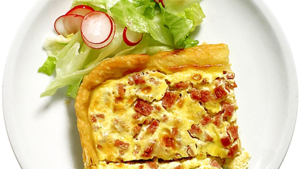 3. Laita piirakkaan kinkkusuikaleita ja juustoraastetta. Vatkaa munat ja maito, mausta suolalla ja mustapippurilla. Kaada munamaito vuokaan täytteiden päälle. Paista uunissa noin 40 minuuttia, kunnes täyte on jähmettynyt.