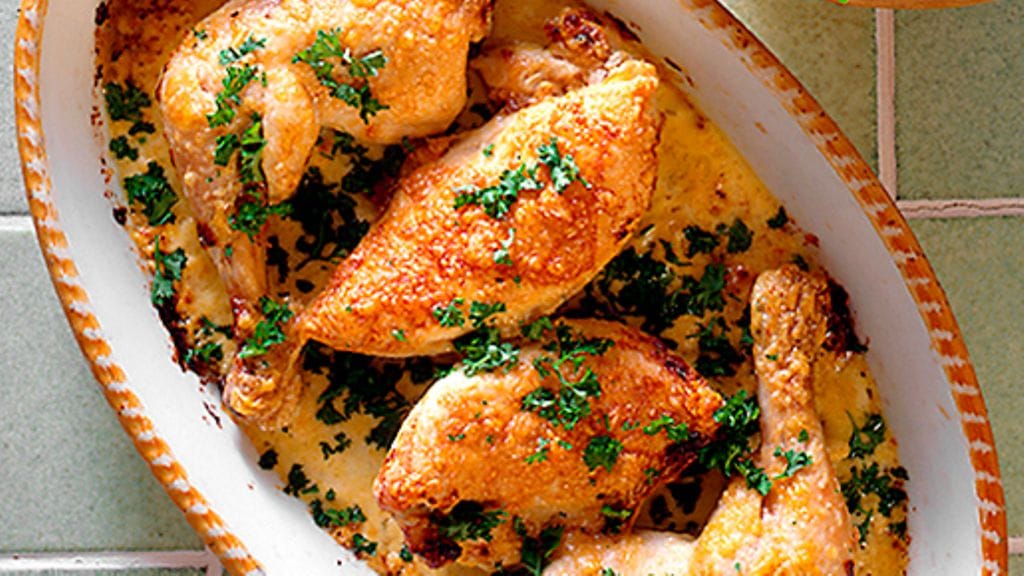 2. Gratinoi ruokaa unissa 30 minuuttia. Tarkista tikulla pistämällä, että broileri on läpikypsä; lihaneste on silloin kirkasta ja läpinäkyvää. Ripottele pinnalle persiljasilppu.