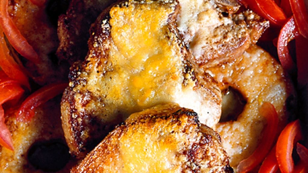 4. Laita omenaviipaleet uunivuokaan, niiden päälle kyljykset ja päälle juustoa.