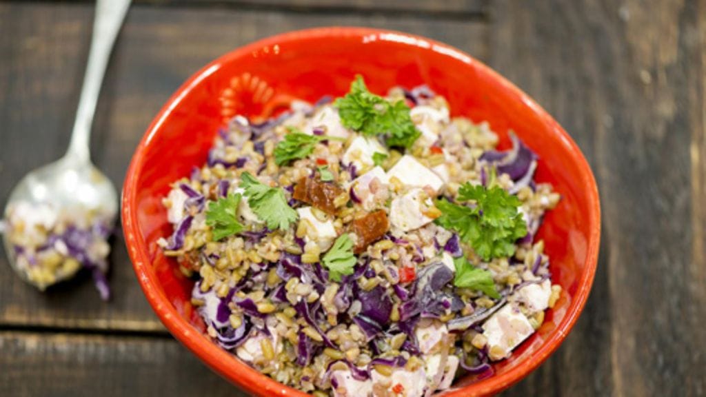 Keitä vehnä kasvisliemikuutiolla maustetussa vedessä miedolla lämmöllä, kunnes vehnä on kypsää ja neste imeytynyt.