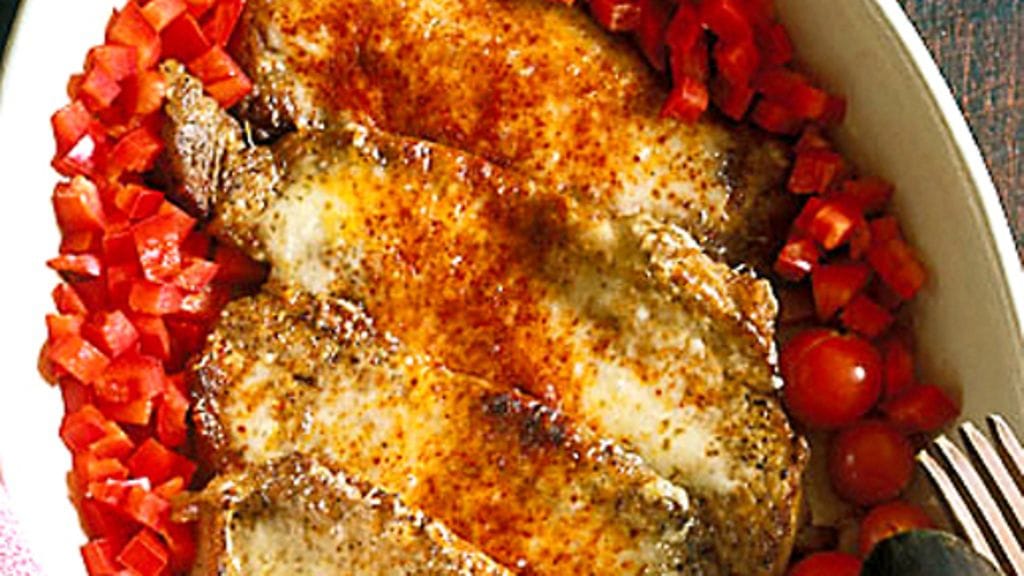 2. Kuumenna uuni 250 asteeseen. Aseta leikkeet uunivuokaan ja levitä paprikasilppu ympärille. Leikkaa tomaatteihin risti ja aseta ne vuokaan. Jaa juustoviipaleet leikkeille ja puuteroi ne paprikajauheella. Gratinoi nopeasti, kunnes juusto on sulanut.