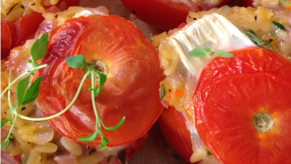 Paista silputtu sipuli ja suikaloitu porkkana öljy-voiseoksessa kasarissa. Lisää vesi, fondi ja pippuria, anna kiehahtaa. Lisää jyväpasta ja tomaattien koverretut sisukset, anna kiehua 5 minuuttia. silppua joukkoon timjamia. Jaa täyte tomaattien sisään, laita jokaisen tomattin keskelle pala vuohenjuustoa ”sydämeksi”. Aseta hatut paikoilleen Paista 225-asteisen uunin keski- tai ylätasolla 15-20 min.