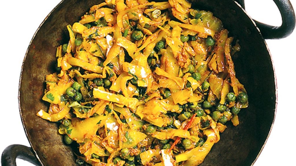 2. Kuumenna öljy keskilämmöllä kattilassa. Pudota öljyyn juustokuminansiemen. Kun öljy tirisee, se on riittävän kuumaa. Lisää öljyyn juustokuminasiemenet ja laakerinlehdet ja kuullota muutama sekunti. Lisää kattilaan kaalisuikaleet sekä herneet ja kuullota puoli minuuttia koko ajan sekoittaen. Sekoita joukkoon chilimauste ja alenna lämpöä. Hauduta kannen alla noin 5 minuuttia, kunnes kaali on pehmentynyt.