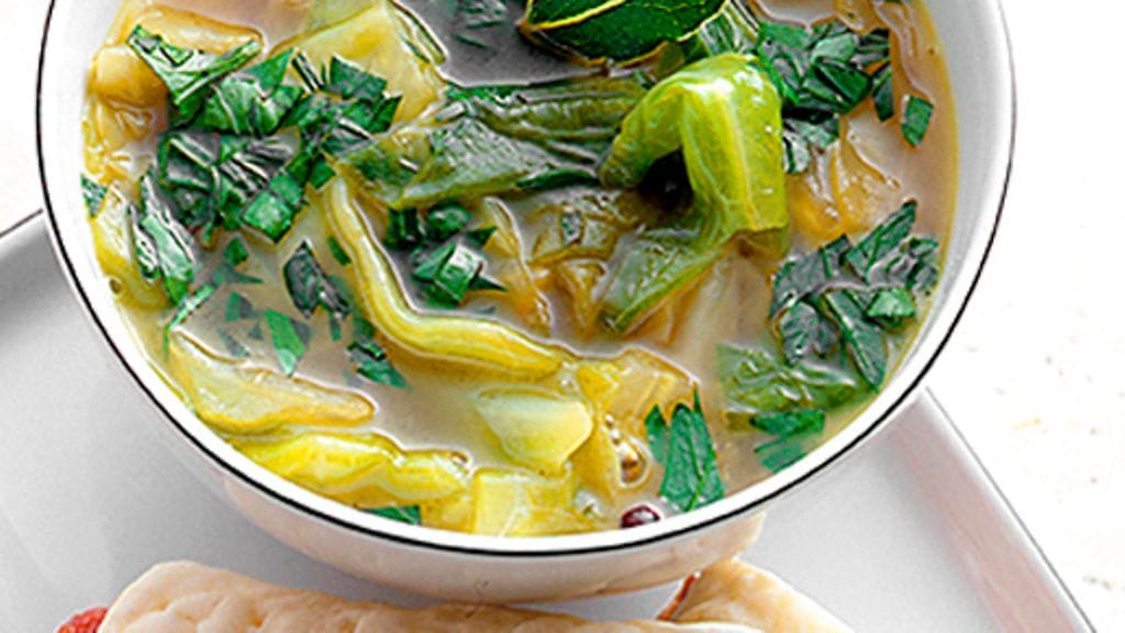 2. Huuhdo ja suikaloi purjo ja kaali. Kuullota niitä voissa isossa padassa. Kaada päälle liemi ja kuumenna kiehuvaksi. Keitä hiljaa 10 minuuttia tai kunnes kaali on kypsää.