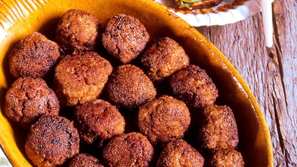 3. Pyöritä isohkoja lihapullia ja paina jokaiseen yksi ruusukaali sisälle, silitä pinta. Kieritä pyörykät korppujauhoissa ja ruskista ne joka puolelta pannulla. Pane jälkikypsymään 200-asteiseen uuniin, kunnes ovat kypsiä.