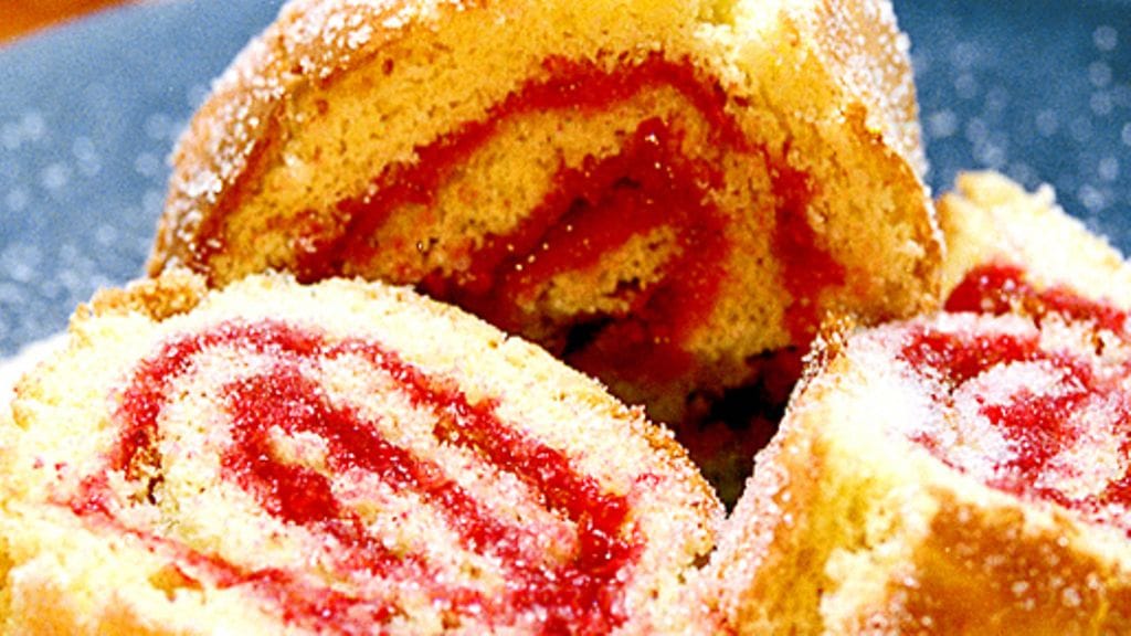 3. Levitä vadelmahillo, kun torttulevy on vielä kuuma, ja rullaa sen jälkeen pituussuunnassa. Kääri sitten sokeroitu voipaperi kakun ympärille ja jäähdytä. Ota paperi pois ja jäähdytä.
