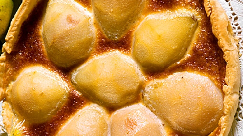 5. Asettele päärynänpuolikkaat piiraspohjalle. Kaada päälle kermakreemi. Paista uunin keskitasolla noin 20 minuuttia.